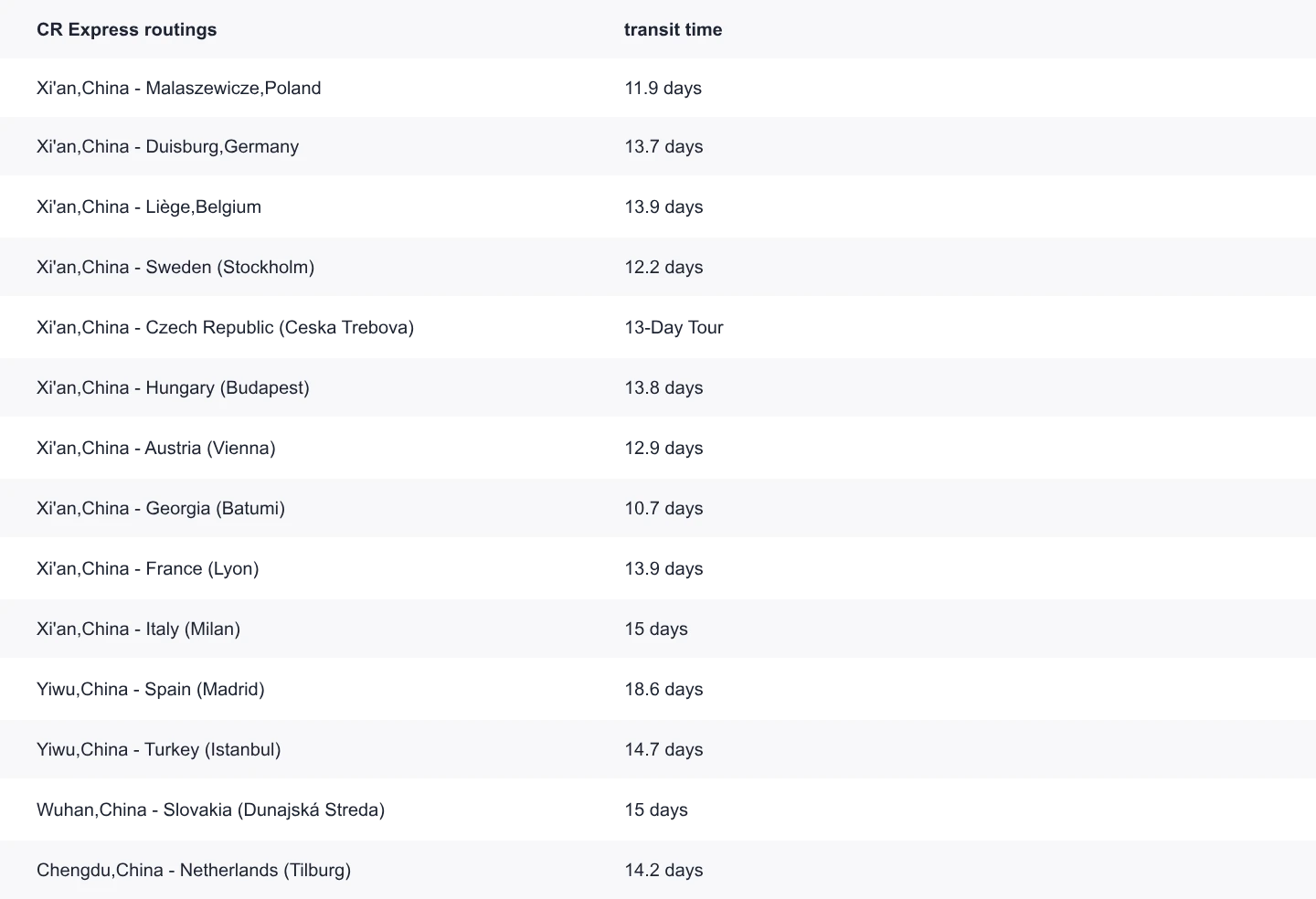 Door pickup, customs clearance, and container packing from hubs include Xi'an, Chengdu, Chongqing,Wuhan,Zhengzhou,Shenzhen,Yiwu.
