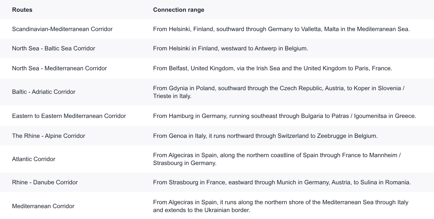 Europe's rail freight network is centered around the nine core freight corridors planned by the EU, and is currently enhancing efficiency through technological innovation.
